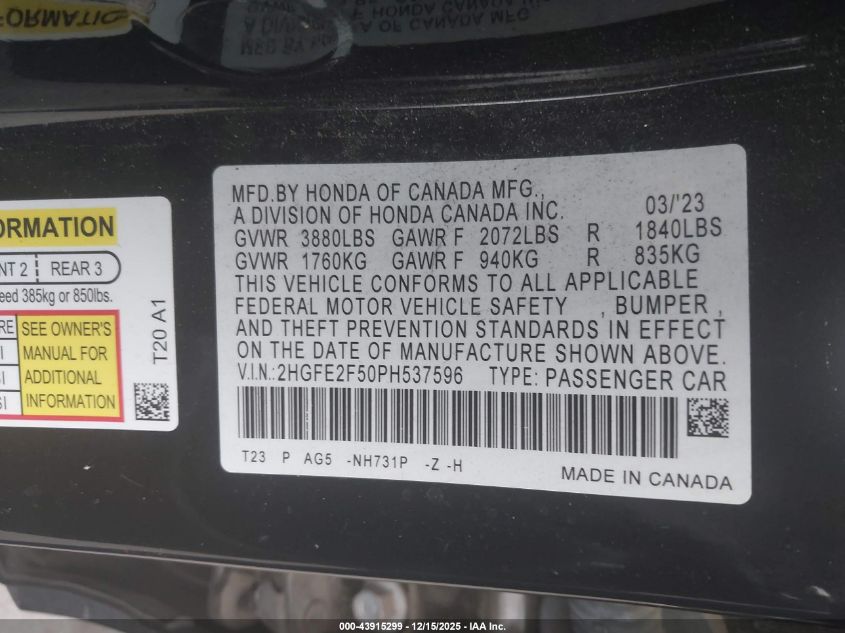 2023 HONDA CIVIC 2023 року Бензин, 2.0, Передній привід, vin - 2HGFE2F50PH537596 з США