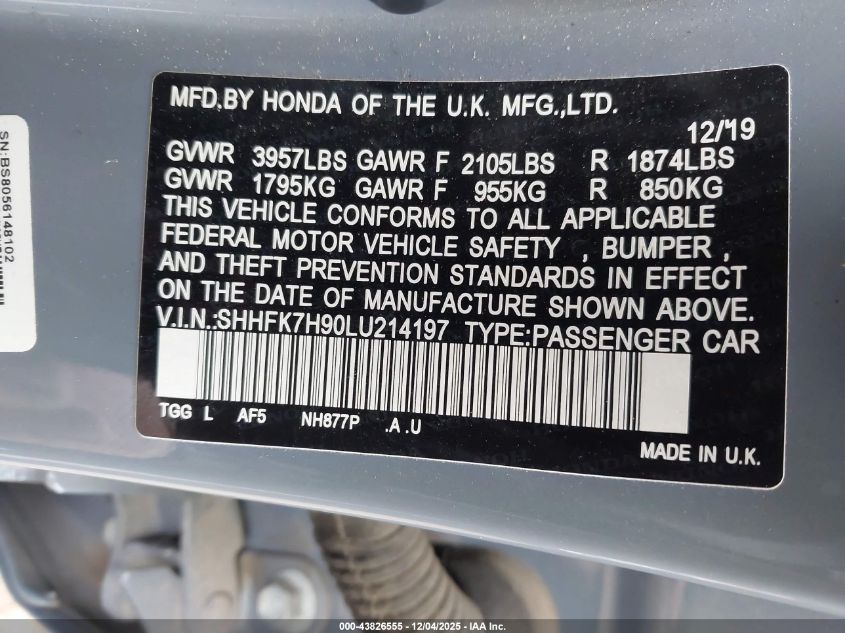 2020 HONDA CIVIC 2020 року Бензин, 1.5, Передній привід, vin - SHHFK7H90LU214197 з США