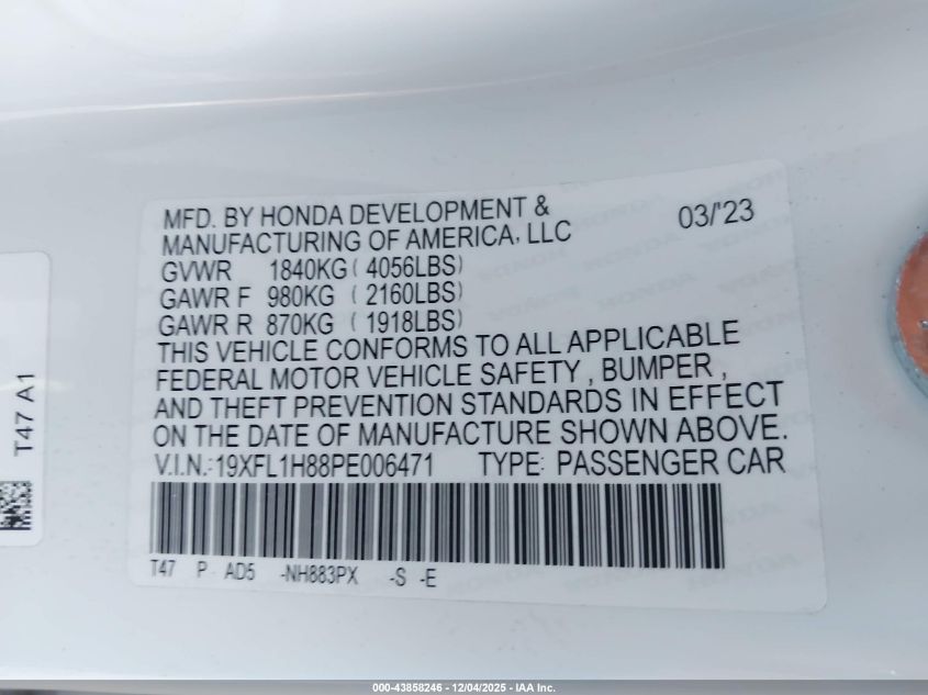 2023 HONDA CIVIC 2023 року Бензин, 1.5, Передній привід, vin - 19XFL1H88PE006471 з США