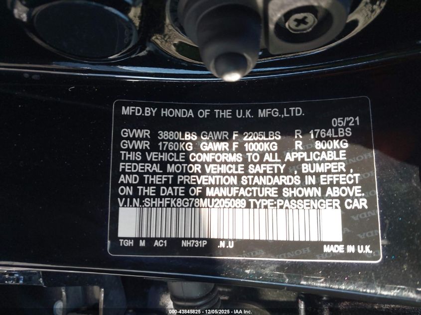 2021 HONDA CIVIC 2021 року Бензин, 2.0, Передній привід, vin - SHHFK8G78MU205089 з США