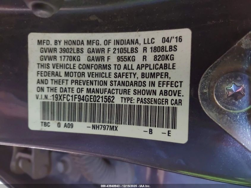 2016 HONDA CIVIC 2016 року Бензин, 1.5, Передній привід, vin - 19XFC1F94GE021562 з США