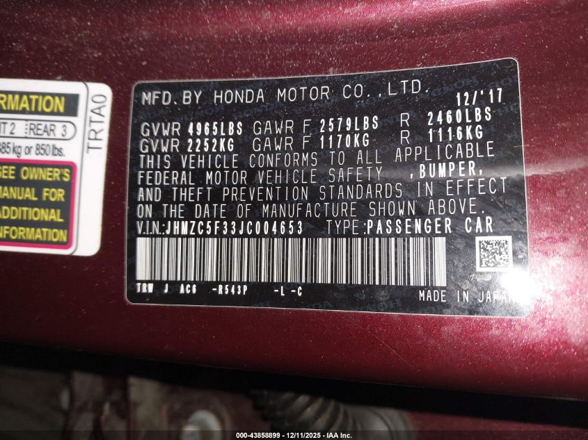 2018 HONDA CLARITY 2018 року Гібрид, 1.5, Передній привід, vin - JHMZC5F33JC004653 з США