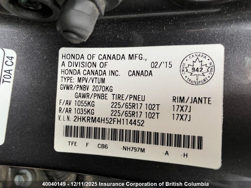 Колір СірийЦиліндри 4Привід Повний привідVIN 2HKRM4H52FH114452Стан СтаціонарноУшкодження Ліва сторонаДата аукціону 2025-12-15 AutoRIA