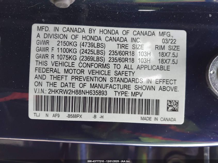 2022 HONDA CR-V 2022 року Бензин, 1.5, Повний привід, vin - 2HKRW2H88NH635893 з США