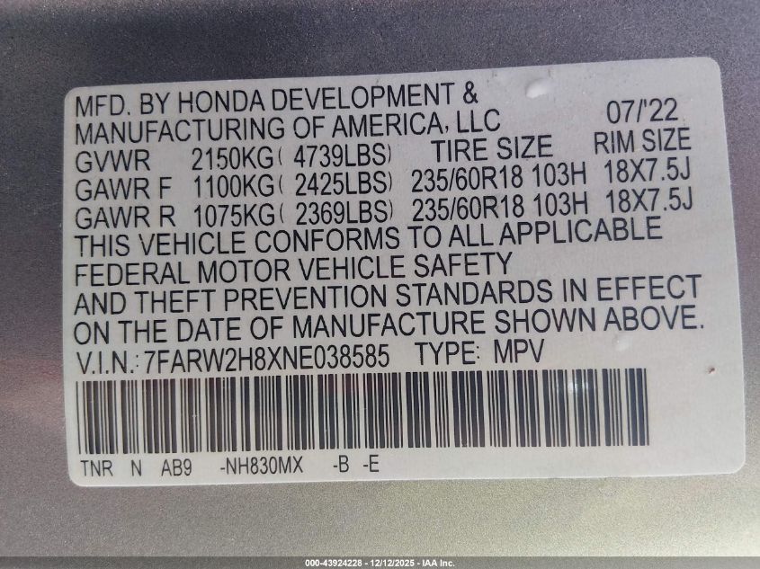 2022 HONDA CR-V 2022 року Бензин, 1.5, Повний привід, vin - 7FARW2H8XNE038585 з США