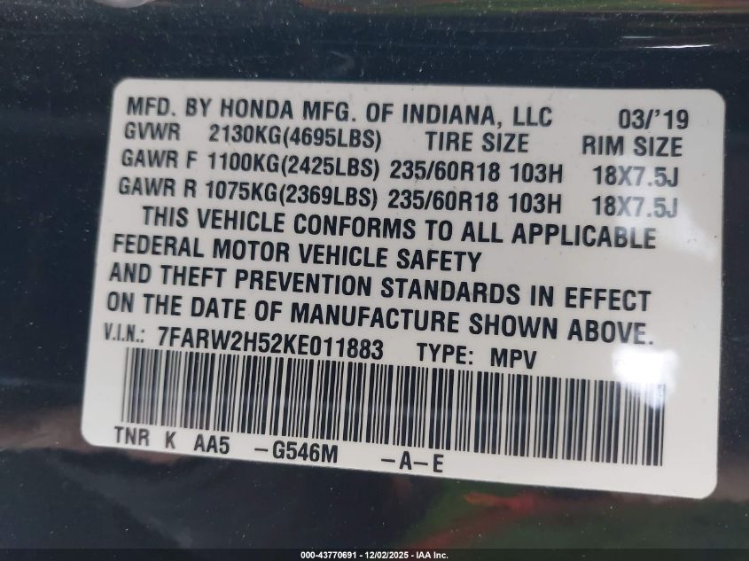 2019 HONDA CR-V 2019 року Бензин, 1.5, Повний привід, vin - 7FARW2H52KE011883 з США