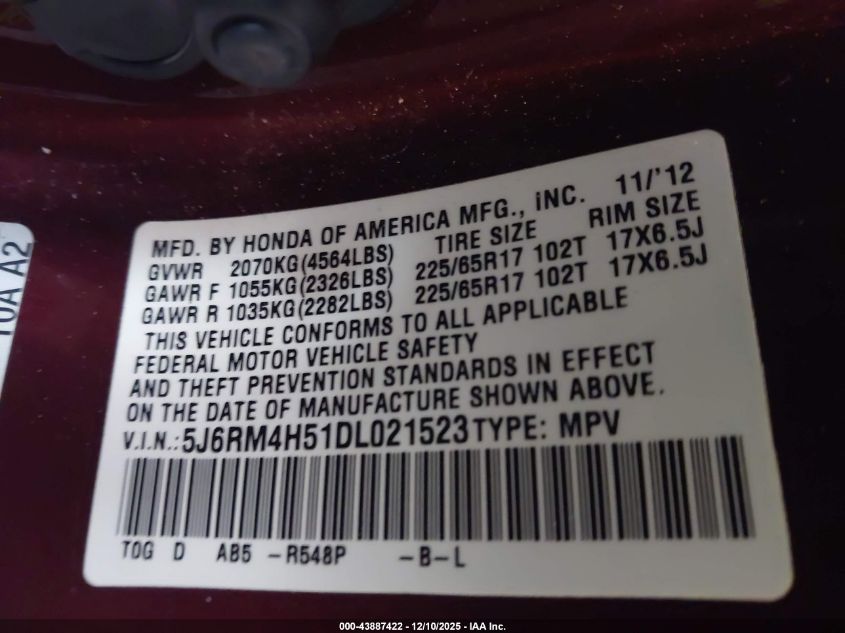 Колір ЧервонийЦиліндри 4Привід Повний привідVIN 5J6RM4H51DL021523Стан Заводиться та їде (перевірено)Ушкодження Передня права AutoRIA