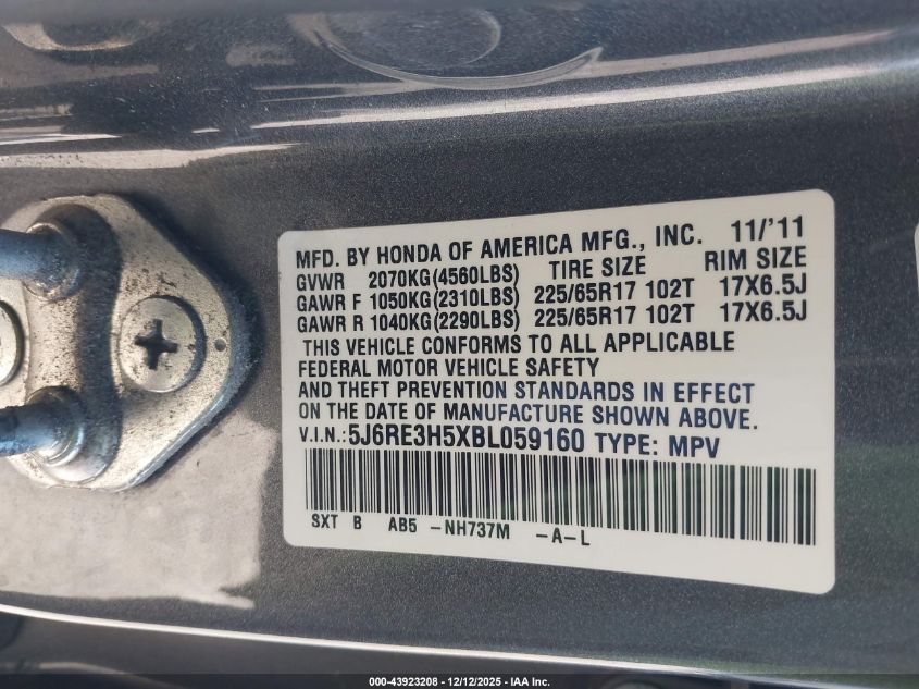 2011 HONDA CR-V 2011 року Бензин, 2.4, Передній привід, vin - 5J6RE3H5XBL059160 з США