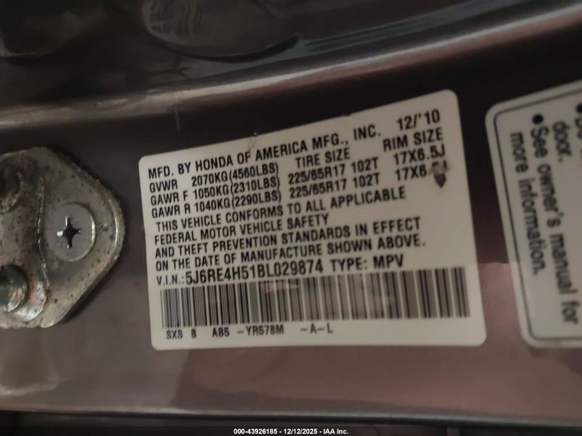2011 HONDA CR-V 2011 року Бензин, 2.4, Повний привід, vin - 5J6RE4H51BL029874 з США