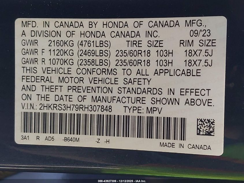 2024 HONDA CR-V 2024 року Бензин, 1.5, Передній привід, vin - 2HKRS3H79RH307848 з США