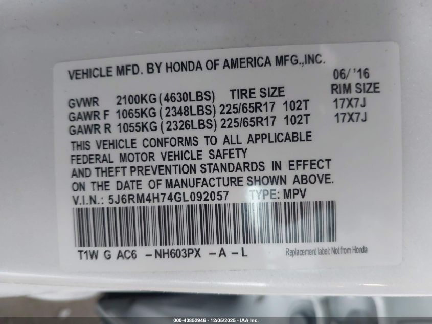 2016 HONDA CR-V 2016 року Бензин, 2.4, Повний привід, vin - 5J6RM4H74GL092057 з США