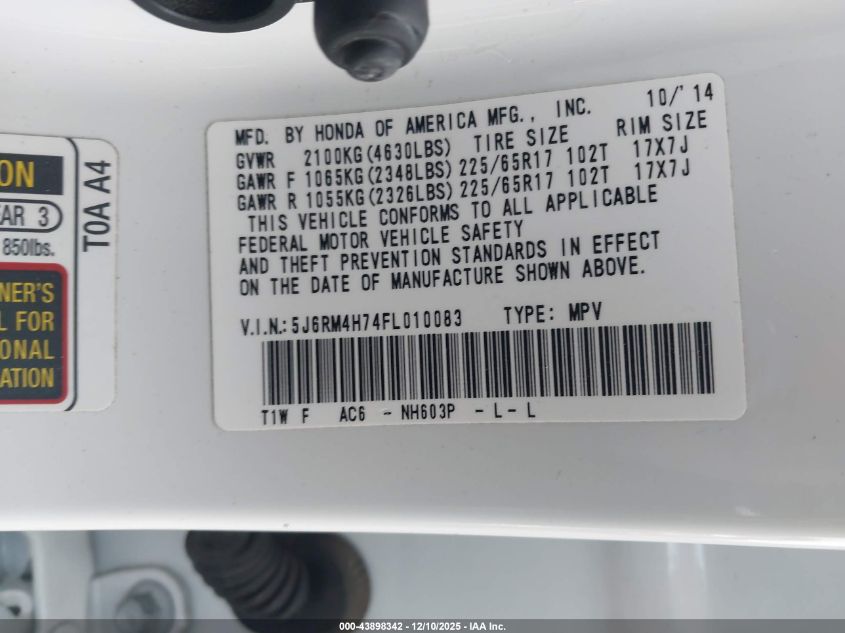 2015 HONDA CR-V 2015 року Бензин, 2.4, Повний привід, vin - 5J6RM4H74FL010083 з США