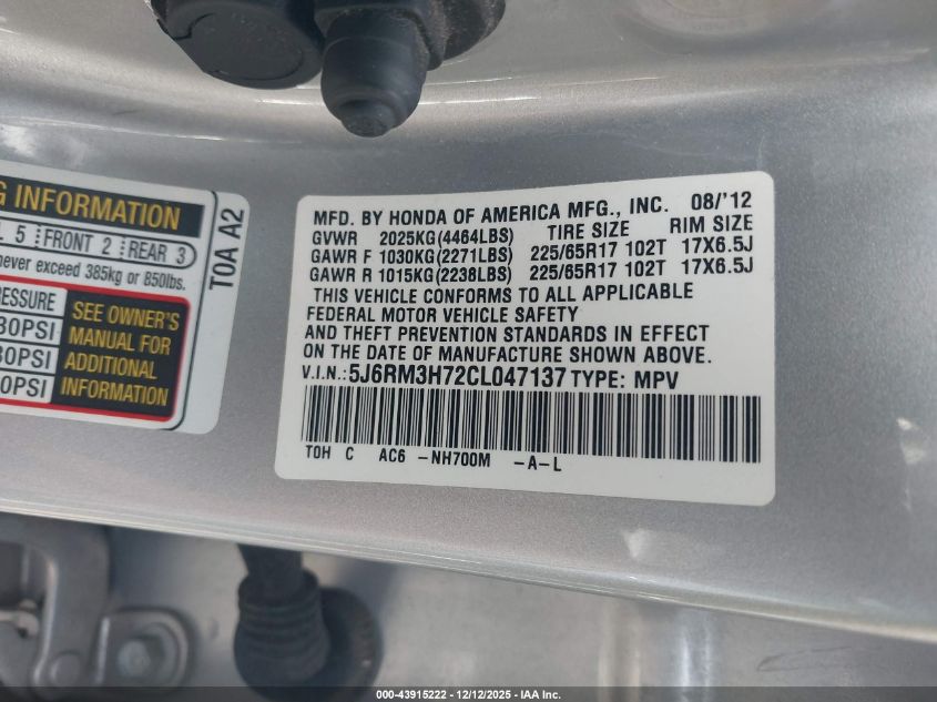 Колір СрібнийЦиліндри 4Привід Передній привідVIN 5J6RM3H72CL047137Стан Заводиться та їде (перевірено)Ушкодження По всьому авто AutoRIA