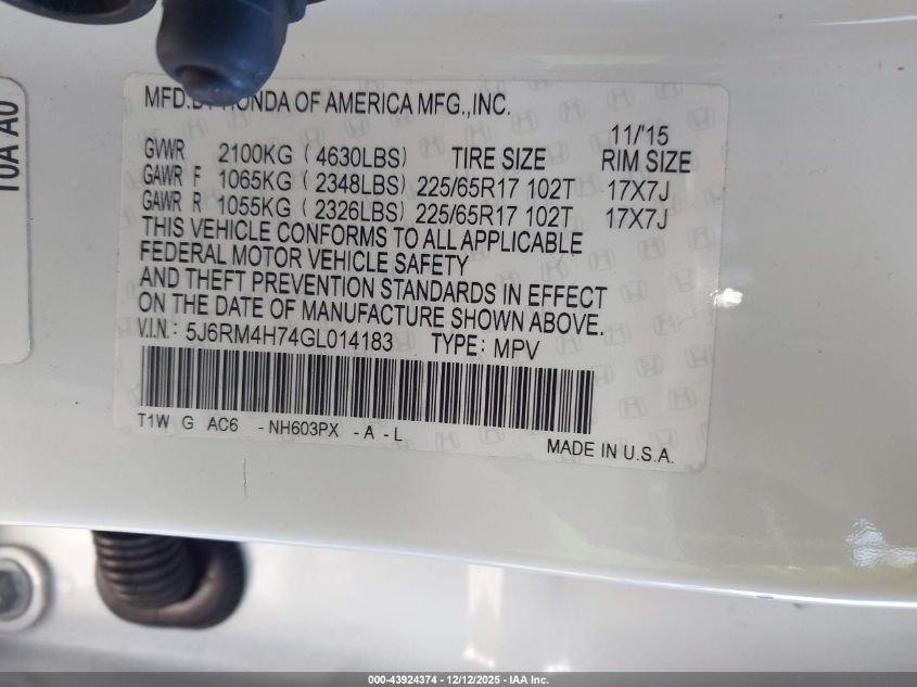 2016 HONDA CR-V 2016 року Бензин, 2.4, Повний привід, vin - 5J6RM4H74GL014183 з США