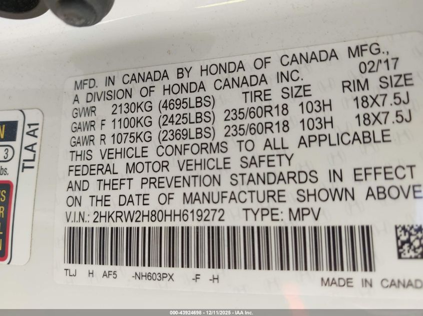 2017 HONDA CR-V 2017 року Бензин, 1.5, Повний привід, vin - 2HKRW2H80HH619272 з США