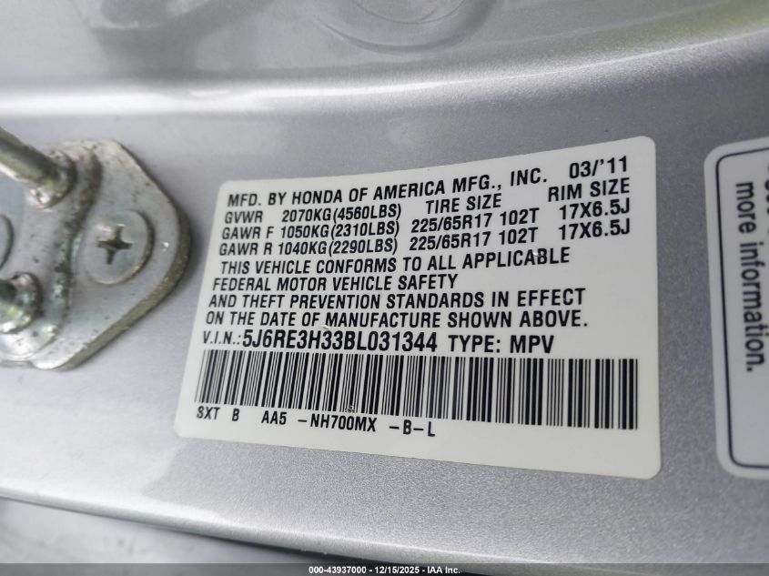 2011 HONDA CR-V 2011 року Бензин, 2.4, Передній привід, vin - 5J6RE3H33BL031344 з США