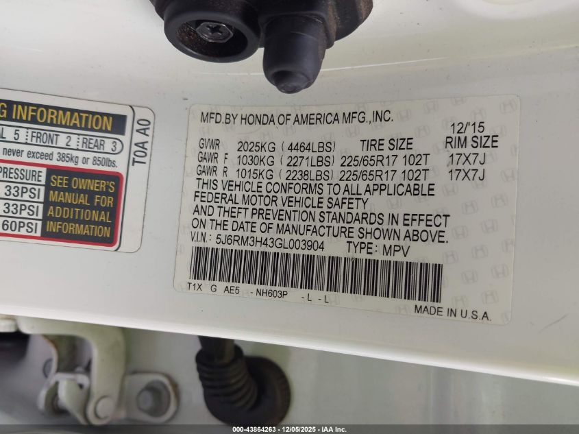 2016 HONDA CR-V 2016 року Бензин, 2.4, Передній привід, vin - 5J6RM3H43GL003904 з США