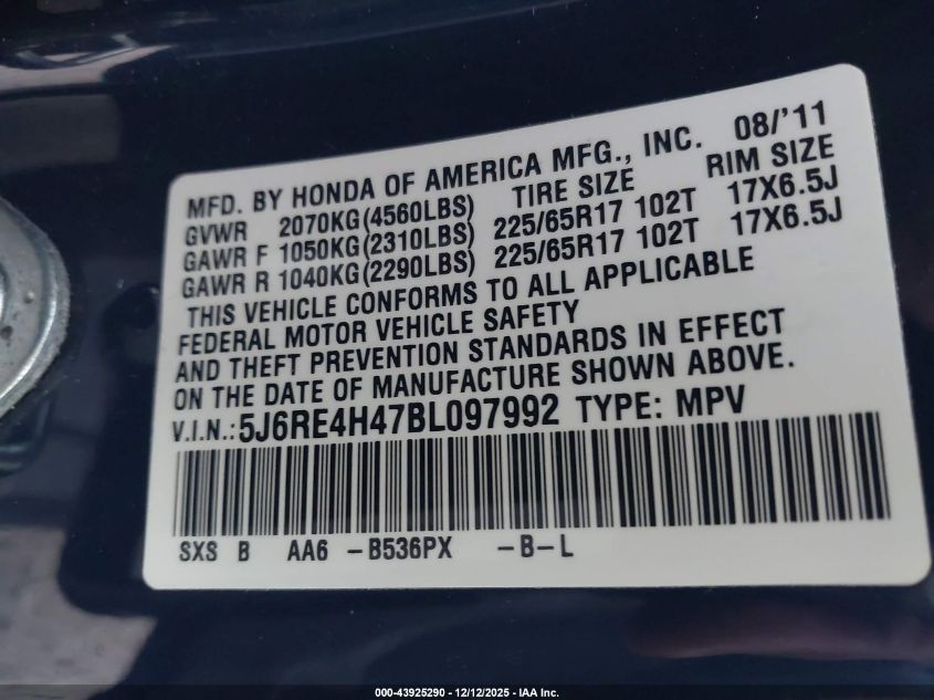 2011 HONDA CR-V 2011 року Бензин, 2.4, Повний привід, vin - 5J6RE4H47BL097992 з США