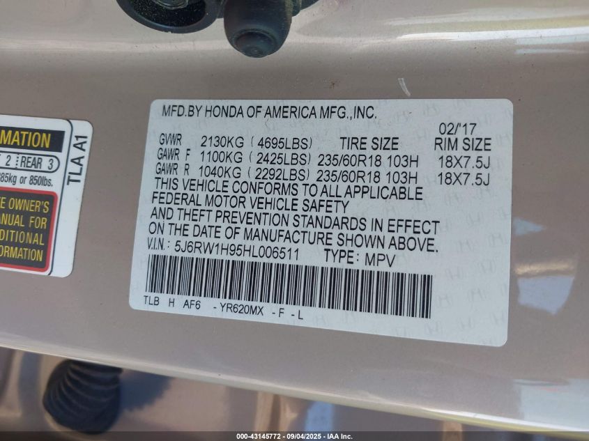2017 HONDA CR-V 2017 року Бензин, 1.5, Передній привід, vin - 5J6RW1H95HL006511 з США