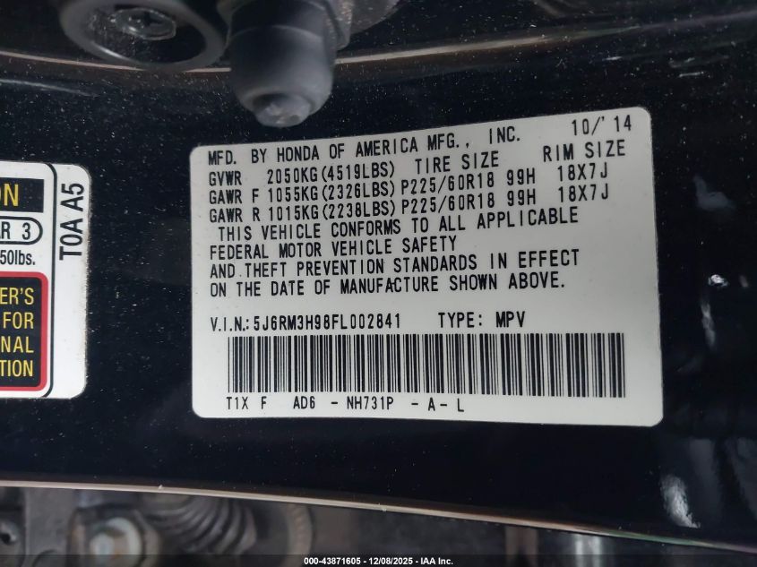 2015 HONDA CR-V 2015 року Бензин, 2.4, Передній привід, vin - 5J6RM3H98FL002841 з США