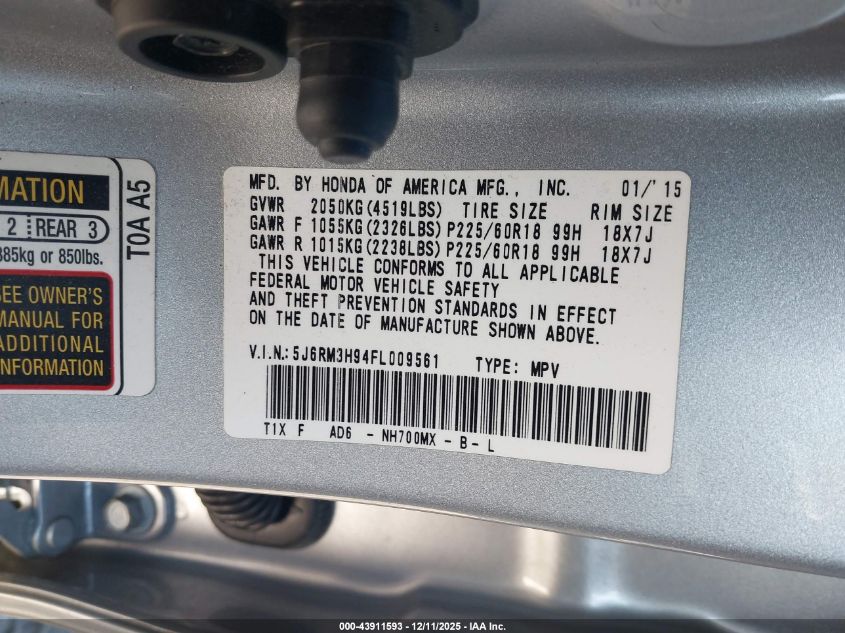 2015 HONDA CR-V 2015 року Бензин, 2.4, Передній привід, vin - 5J6RM3H94FL009561 з США