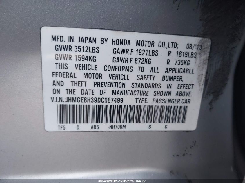 2013 HONDA FIT 2013 року Бензин, 1.5, Передній привід, vin - JHMGE8H39DC067499 з США