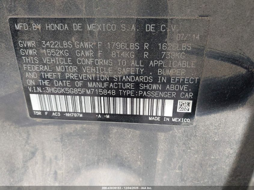 Колір СірийЦиліндри 4Привід Передній привідVIN 3HGGK5G85FM715848Стан СтаціонарноУшкодження Передня ліва AutoRIA
