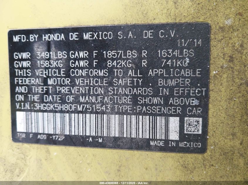 Колір ЖовтийЦиліндри 4Привід Передній привідVIN 3HGGK5H80FM751543Стан Заводиться та їде (перевірено)Ушкодження Ліва сторона AutoRIA