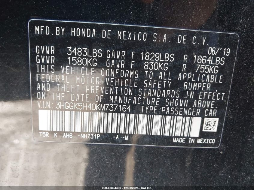 2019 HONDA FIT 2019 року Бензин, 1.5, Передній привід, vin - 3HGGK5H40KM737164 з США