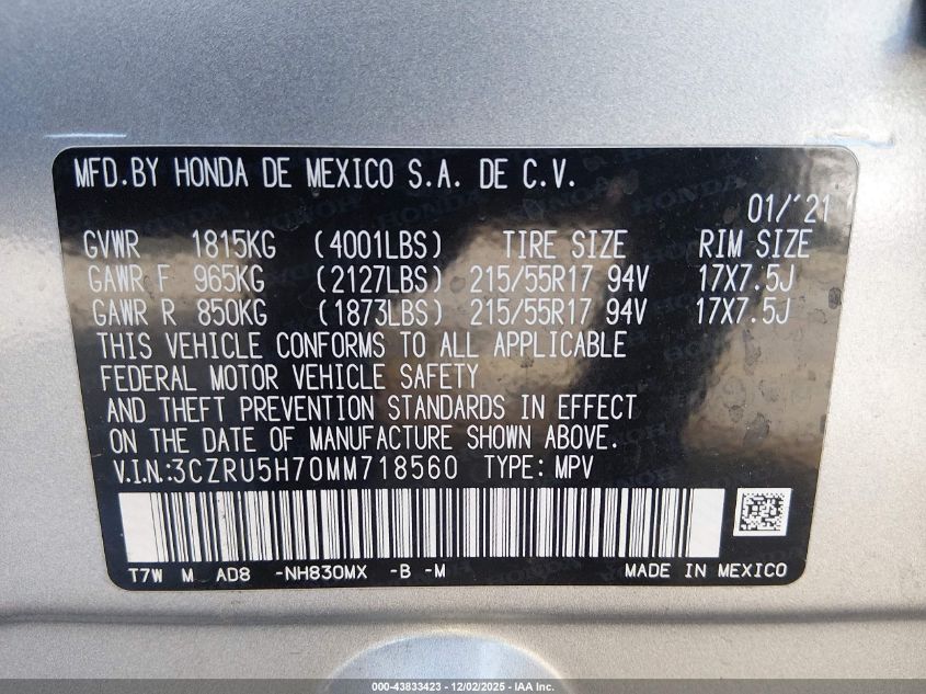 2021 HONDA HR-V 2021 року Бензин, 1.8, Передній привід, vin - 3CZRU5H70MM718560 з США