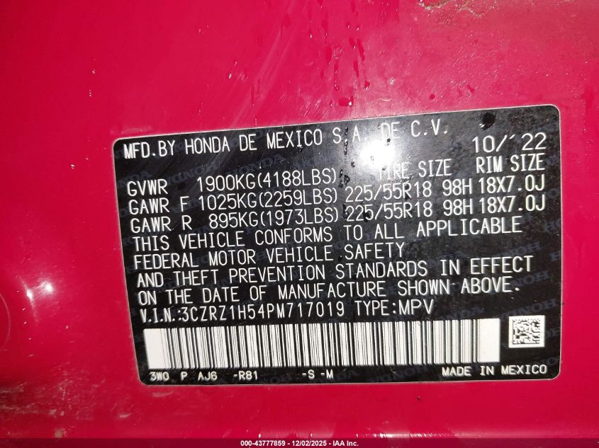 2023 HONDA HR-V 2023 року Бензин, 2.0, Передній привід, vin - 3CZRZ1H54PM717019 з США