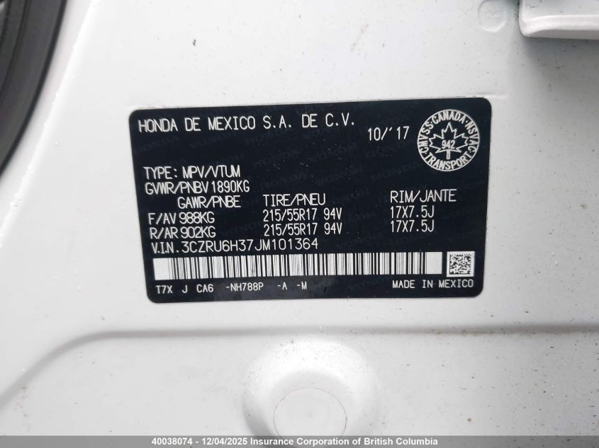 Колір БілийЦиліндри 4Привід Повний привідVIN 3CZRU6H37JM101364Стан Заводиться та їде (перевірено)Ушкодження Передня праваДата аукціону 2025-12-08 AutoRIA