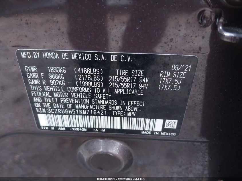 2022 HONDA HR-V 2022 року Бензин, 1.8, Повний привід, vin - 3CZRU6H51NM716421 з США