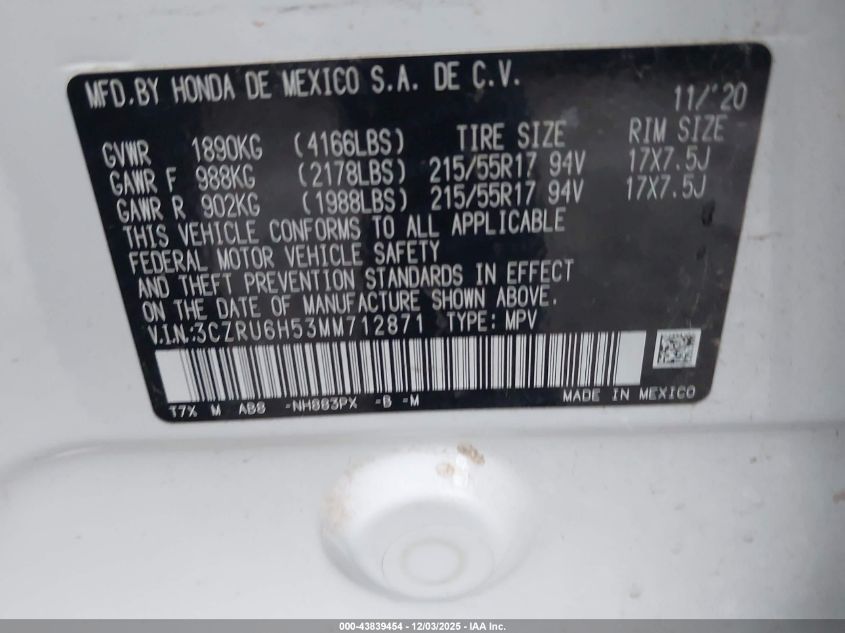 2021 HONDA HR-V 2021 року Бензин, 1.8, Повний привід, vin - 3CZRU6H53MM712871 з США