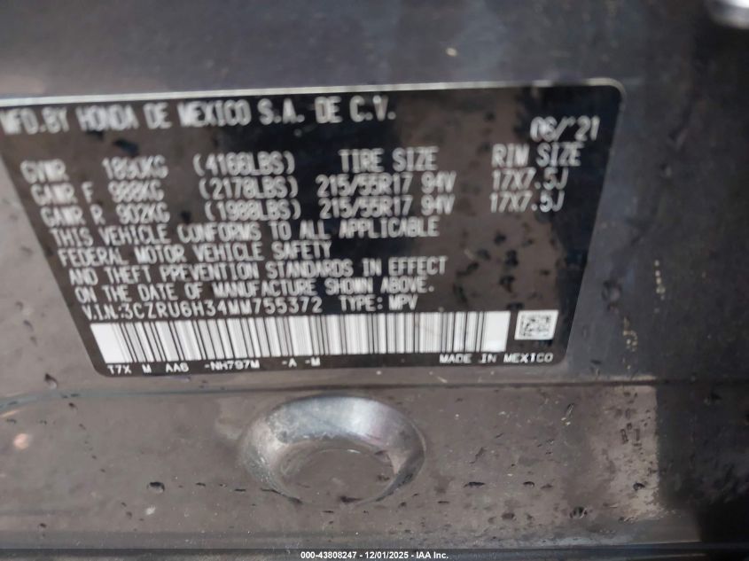 2021 HONDA HR-V 2021 року Бензин, 1.8, Повний привід, vin - 3CZRU6H34MM755372 з США