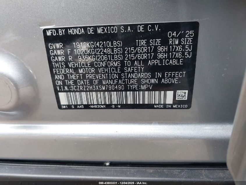 2025 HONDA HR-V 2025 року Бензин, 2.0, Повний привід, vin - 3CZRZ2H3XSM790490 з США