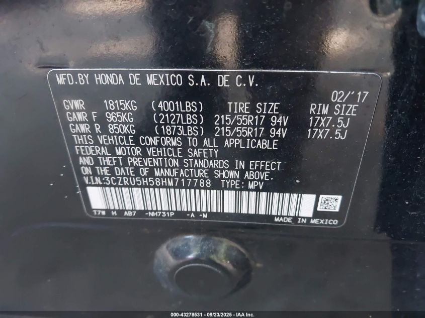 2017 HONDA HR-V 2017 року Бензин, 1.8, Передній привід, vin - 3CZRU5H58HM717788 з США