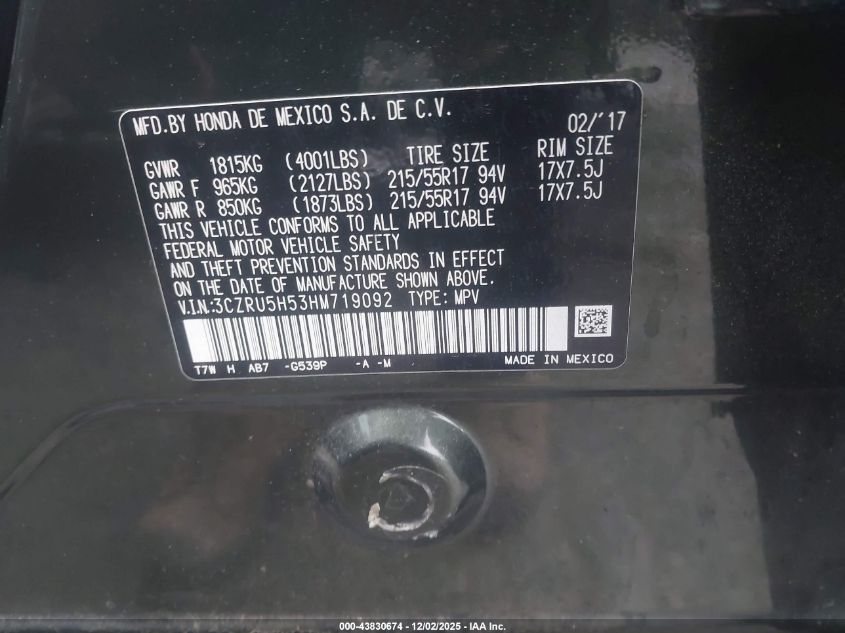 2017 HONDA HR-V 2017 року Бензин, 1.8, Передній привід, vin - 3CZRU5H53HM719092 з США