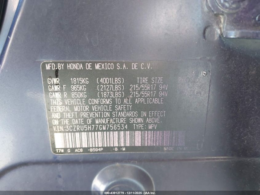 2016 HONDA HR-V 2016 року Бензин, 1.8, Передній привід, vin - 3CZRU5H77GM756534 з США