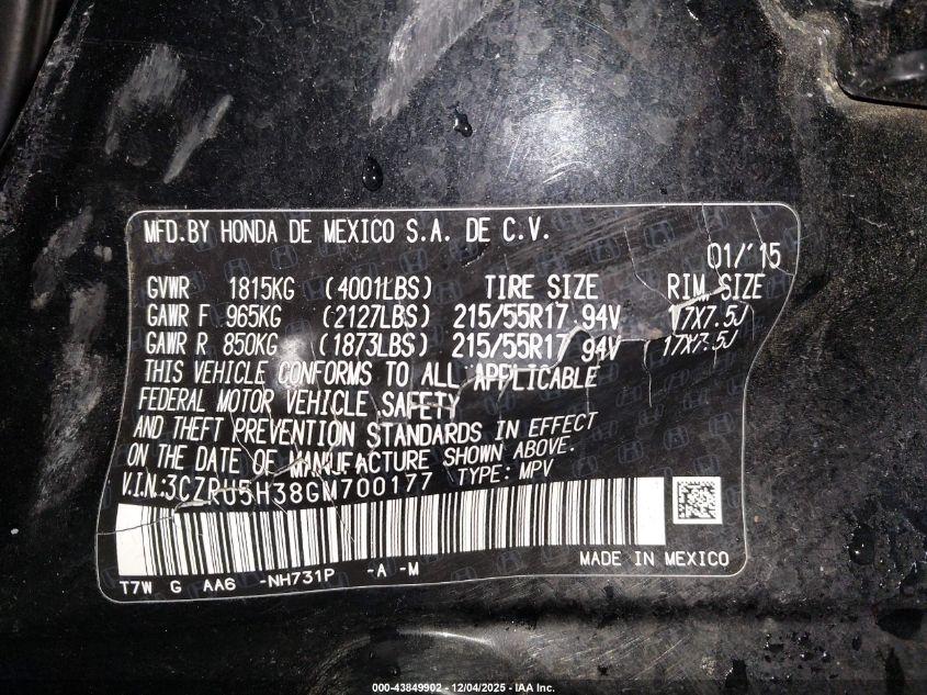 2016 HONDA HR-V 2016 року Бензин, 1.8, Передній привід, vin - 3CZRU5H38GM700177 з США