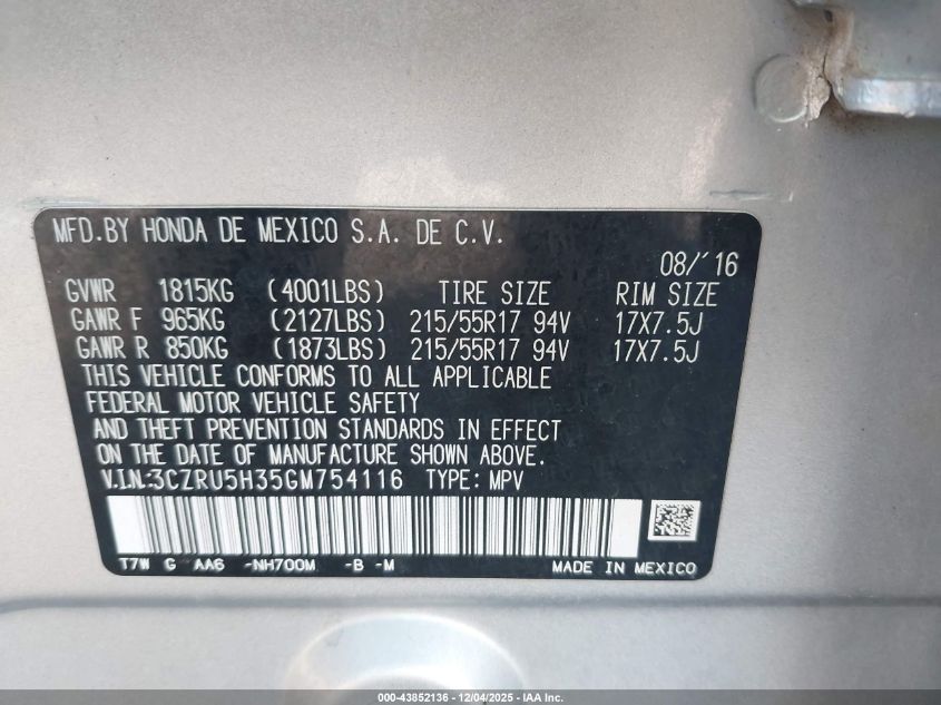 2016 HONDA HR-V 2016 року Бензин, 1.8, Передній привід, vin - 3CZRU5H35GM754116 з США