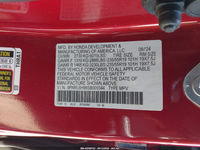 2025 HONDA ODYSSEY 2025 року Бензин, 3.5, Передній привід, vin - 5FNRL6H98SB009344 з США