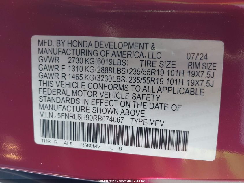 2024 HONDA ODYSSEY 2024 року Бензин, 3.5, Передній привід, vin - 5FNRL6H90RB074067 з США