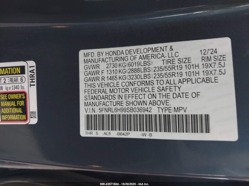 2025 HONDA ODYSSEY 2025 року Бензин, 3.5, Передній привід, vin - 5FNRL6H99SB036942 з США