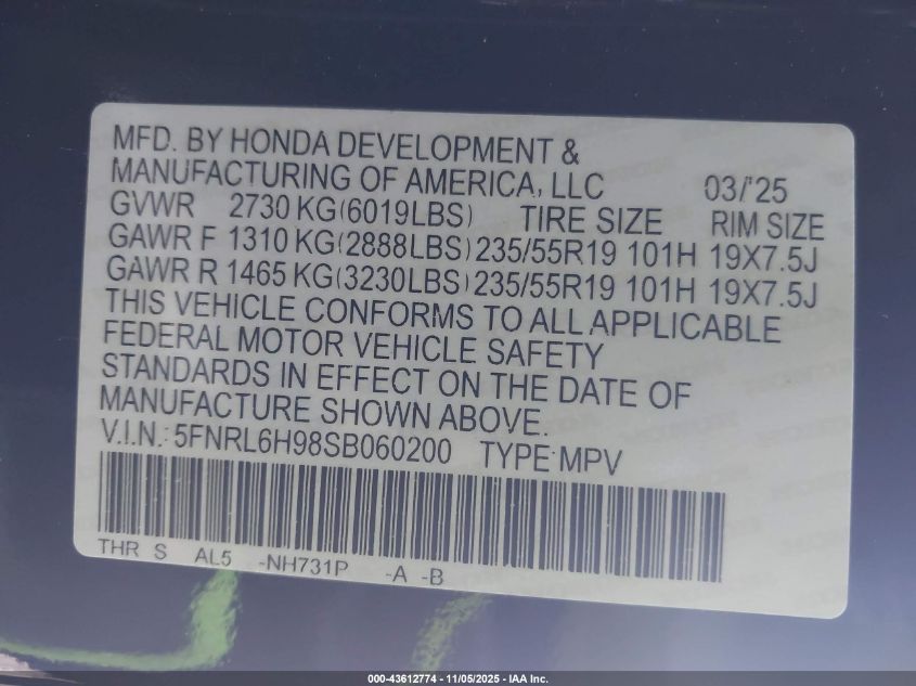 2025 HONDA ODYSSEY 2025 року Бензин, 3.5, Передній привід, vin - 5FNRL6H98SB060200 з США