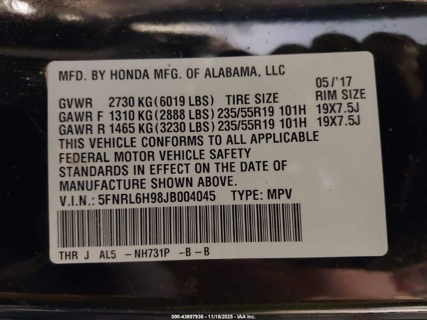 Колір СинійЦиліндри 6Привід Передній привідVIN 5FNRL6H98JB004045Стан Заводиться та їде (перевірено)Ушкодження Передня або задняДата аукціону 2025-12-08 AutoRIA