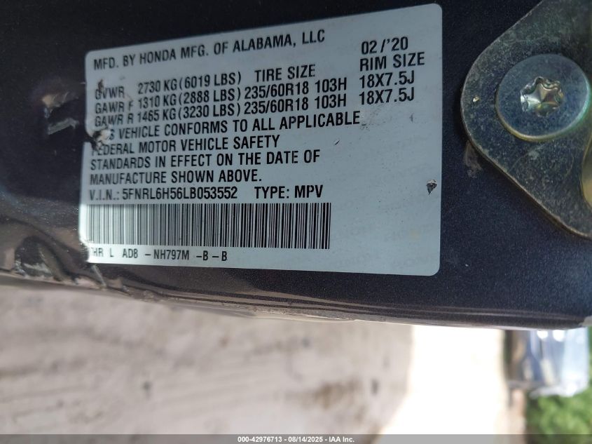 2020 HONDA ODYSSEY 2020 року Бензин, 3.5, Передній привід, vin - 5FNRL6H56LB053552 з США