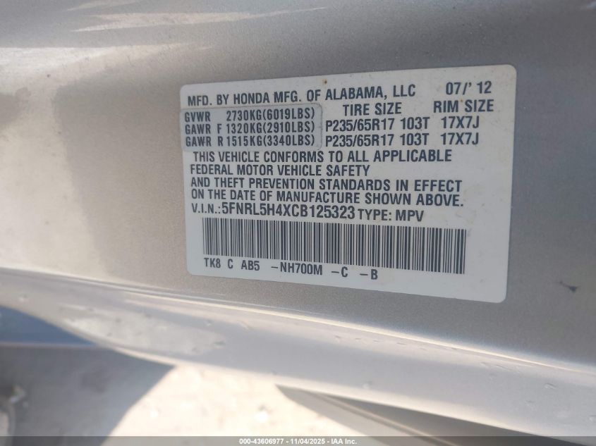 Колір СрібнийЦиліндри 6Привід Передній привідVIN 5FNRL5H4XCB125323Стан Заводиться та їде (перевірено)Ушкодження ЗадняДата аукціону 2025-12-10 AutoRIA