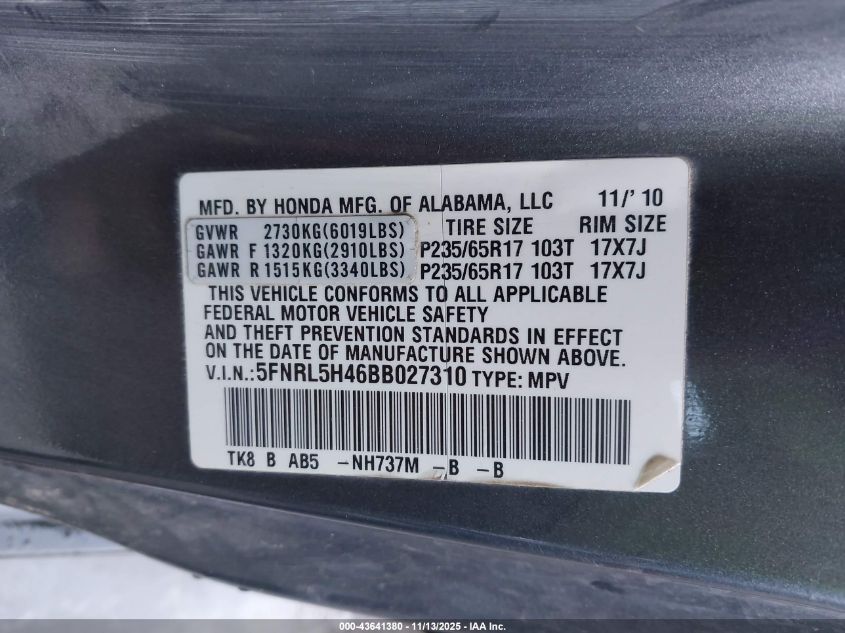 Колір СірийЦиліндри 6Привід Передній привідVIN 5FNRL5H46BB027310Стан Заводиться та їде (перевірено)Ушкодження ГрадДата аукціону 2025-12-11 AutoRIA