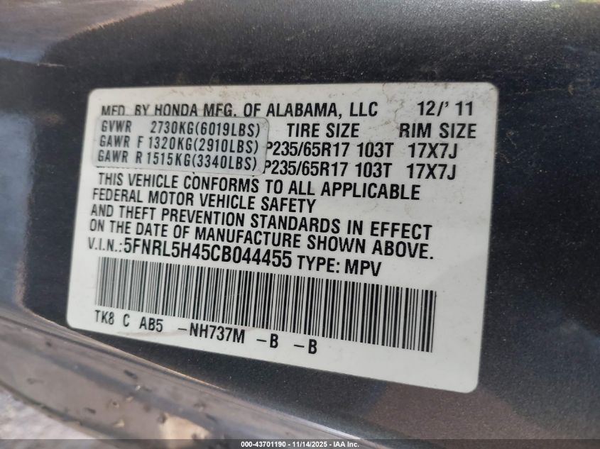 Колір СірийЦиліндри 6Привід Передній привідVIN 5FNRL5H45CB044455Стан Заводиться та їде (перевірено)Ушкодження Передня або задня AutoRIA